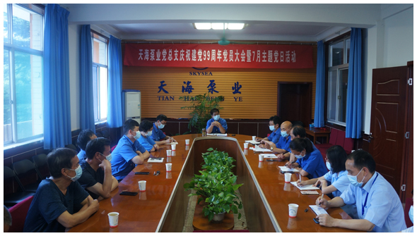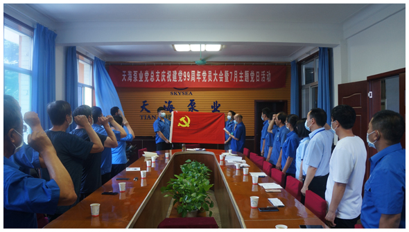 下午3:00,公司二樓會議室,天海泵業(yè)全體黨員在這里隆重集會,慶祝建黨99周年,并開展7月主題黨日活動。全體黨員面對著鮮紅的黨旗,高舉右手,莊嚴(yán)地重溫入黨誓詞:“我自愿加入中國共產(chǎn)黨,擁護黨的綱領(lǐng)……隨時準(zhǔn)備為黨和人民犧牲一切,永不叛黨!眻远ǘ懥恋穆曇艋厥幵谔旌#赃@樣的方式拉開了當(dāng)天以“踐行領(lǐng)袖囑托,率先蹚出新路”為主題的黨日活動的序幕。