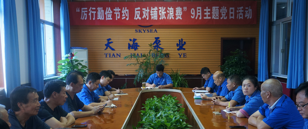 根據(jù)區(qū)委組織部統(tǒng)一安排,天海泵業(yè)黨總支組織全體黨員,于9月7日下午,在公司二樓會議室開展以“厲行勤儉節(jié)約,反對鋪張浪費”為主題的9月主題黨日活動。會上,全體黨員認真學習了《習近平談治國理政》第三卷中的用典;新聞報道:習近平主持召開經濟社會領域專家座談會強調:著眼長遠、把握大勢、開門問策、集思廣益,研究新情況,作出新規(guī)劃;人民日報評論員文章:把做實做強做優(yōu)實體經濟作為主攻方向;習近平在經濟社會領域專家座談會上的講話。