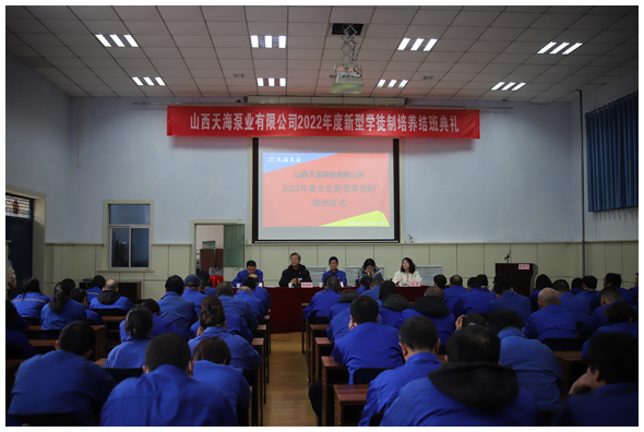 12月13日在公司職教中心召開了“運城龍翔教育集團與山西天海泵業(yè)有限公司2022-2023年企業(yè)新型學(xué)徒制結(jié)班儀式”。共有來自各科室、車間學(xué)員代表93人參加,并為部分優(yōu)秀導(dǎo)師及學(xué)員發(fā)放了榮譽證書和結(jié)業(yè)證書。受公司董事長劉院昌、總經(jīng)理耿尚友委托,由公司黨總支書記寧克法出席參加,運城龍翔教育集團副總裁兼黨組書記楊玉棟、運城龍翔教育集團秘書長宋紅杰、運城龍翔教育集團培訓(xùn)部主任袁萌等應(yīng)邀參加,會議由公司綜合辦主任唐軍長主持。