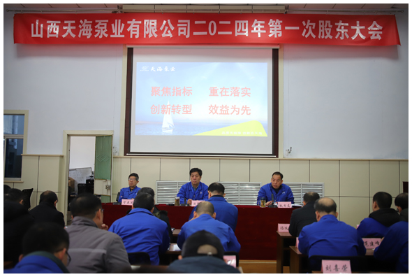 1月26日“山西天海泵業(yè)(集團(tuán))有限公司二〇二四年第一次股東大會(huì)”在公司職教中心隆重召開(kāi),出席大會(huì)的有全體股東代表、集團(tuán)中層以上干部和后勤管理人員列席。集團(tuán)公司董事長(zhǎng)劉院昌、黨總支書記寧克法、總經(jīng)理耿尚友在主席前臺(tái)就座,會(huì)議由寧克法同志主持。